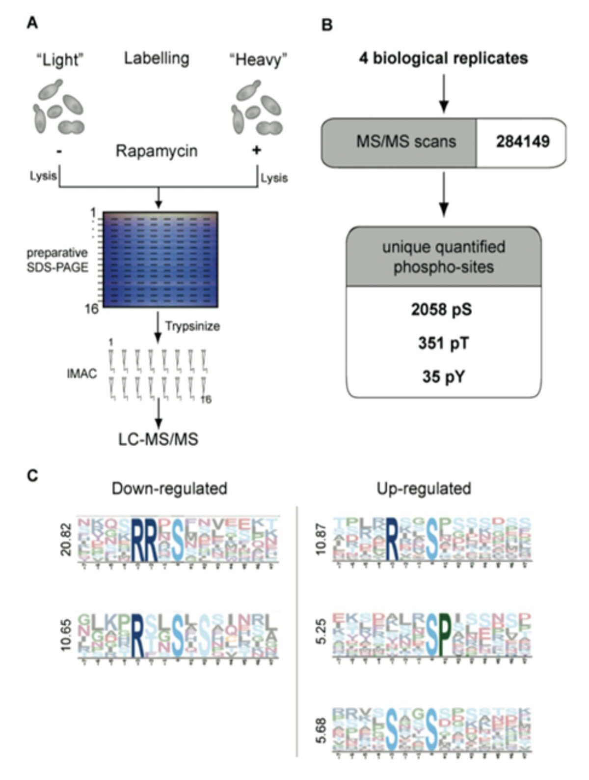 Fig. 1: Quantitative analysis of the rapamycin-sensitive phosphoproteome by SILAC. A) Two yeast cultures are metabolically labeled with normal or isotopically labeled Lysine and Arginine (heavy culture). The heavy culture is treated for 15 minutes with rapamycin. Cell lysates mixed in a ratio of 1:1 are separated by preparative SDS-PAGE, sliced into horizontal bands and proteins are digested. Phosphopeptides are enriched via IMAC and measured in an LTQ-Orbitrap. B) Four independent experiments yielded 972 phosphoproteins, corresponding to 2,383 unique phosphopeptides. C) Motif analysis with Motif-X of all down-regulated and up-regulated phosphopeptide sequences. Motifs are ranked from top to bottom according to their score.
